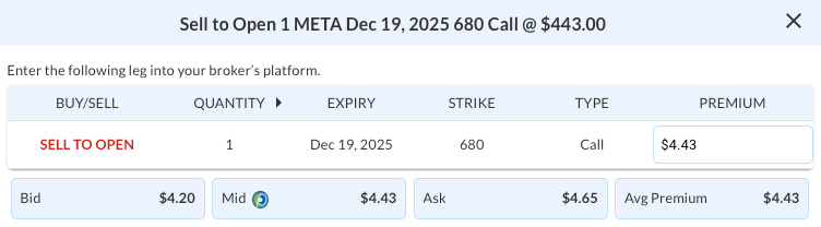 Details: Sell to Open 1 META Dec 19 $680 Call @ $4.43 Credit.