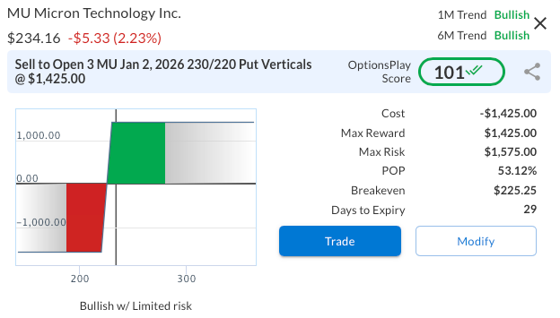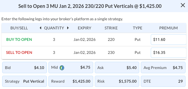 Details: Sell to Open 3 MU Jan 02 $230/$220 Put Vertical Spreads @ $4.75 Credit per Contract.