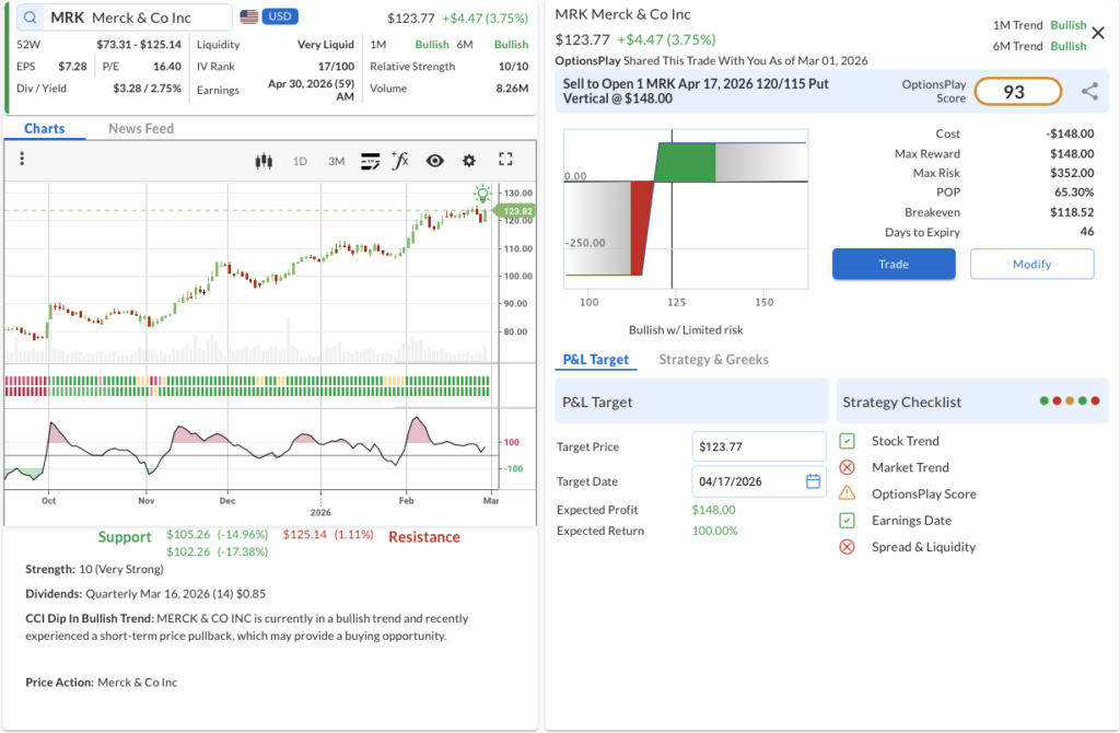 • The Trade: Sell to Open the MRK Apr 17, 2026 120/115 Put Vertical @ $1.48 Credit.