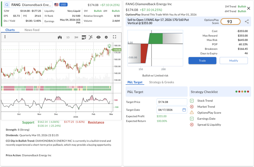 • The Trade: Sell to Open the FANG Apr 17, 2026 170/160 Put Vertical @ $3.55 Credit.