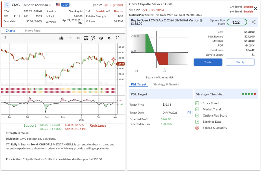 • The Trade: Buy to Open the CMG Apr 2, 2026 38/34 Put Vertical @ $1.58 Debit.