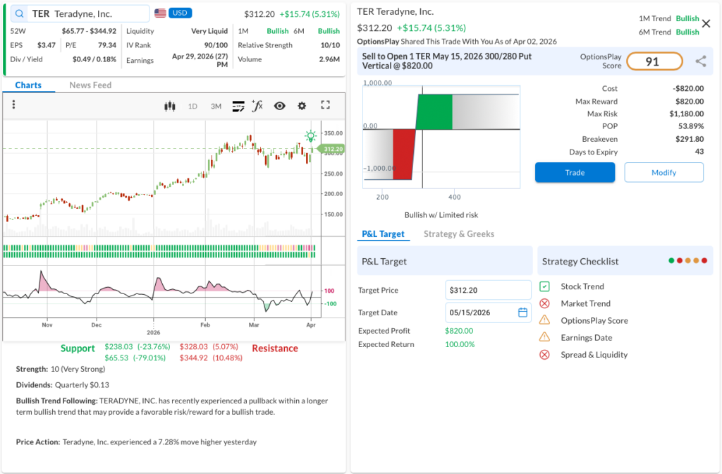 - The Trade: Sell to Open the TER May 15, 2026 300/280 Put Vertical @ $8.20 Credit.