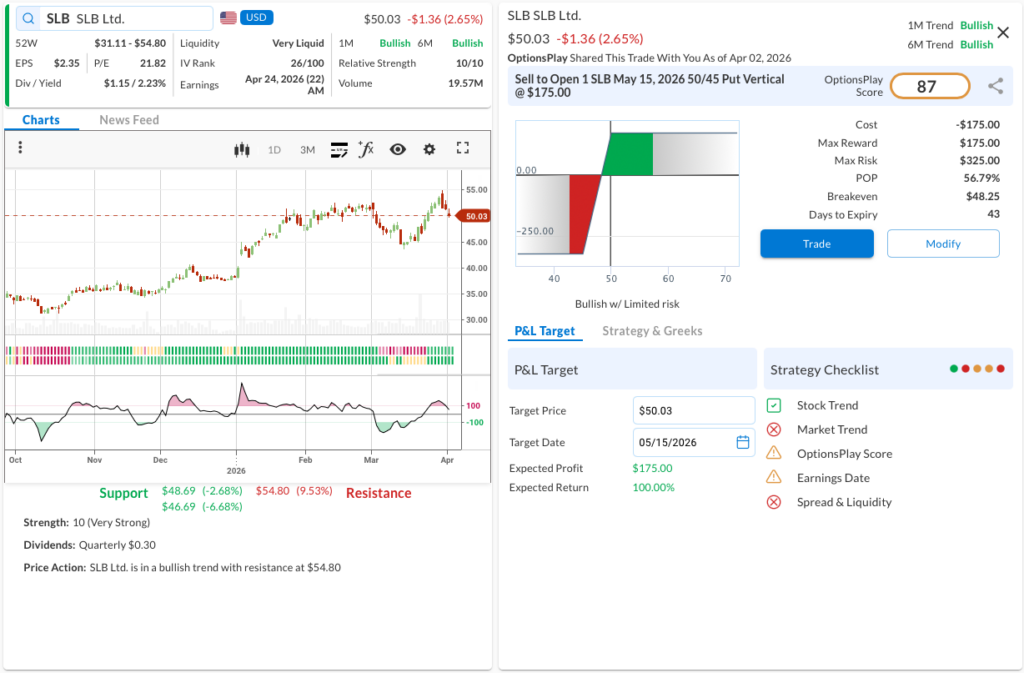 - The Trade: Sell to Open the SLB May 15, 2026 50/45 Put Vertical @ $1.75 Credit.