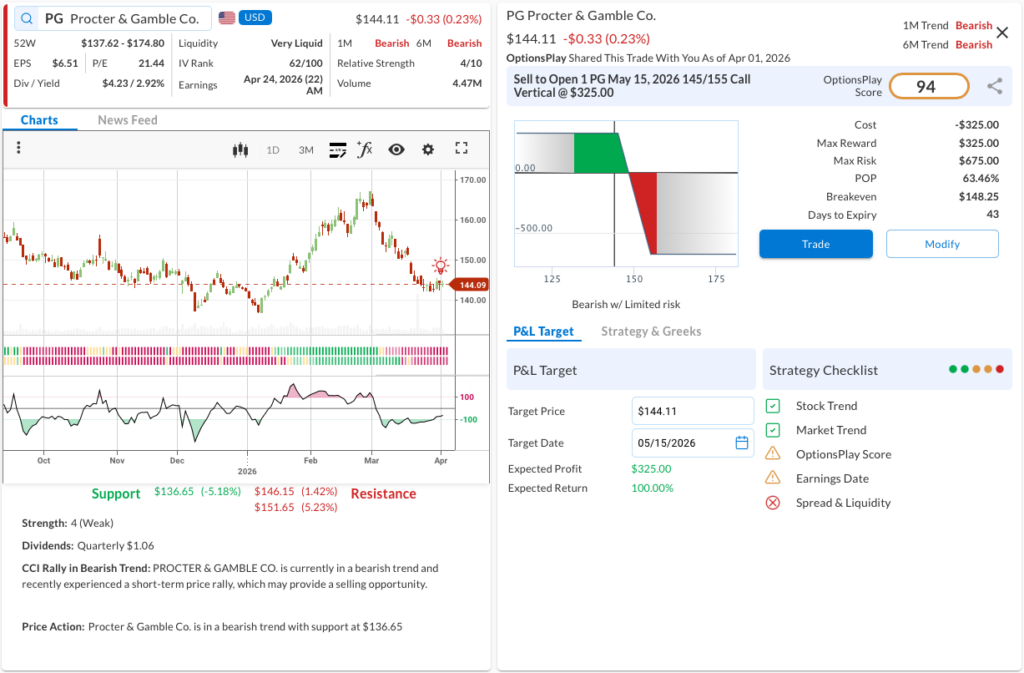 - The Trade: Sell to Open the PG May 15, 2026 145/155 Call Vertical @ $3.25 Credit.