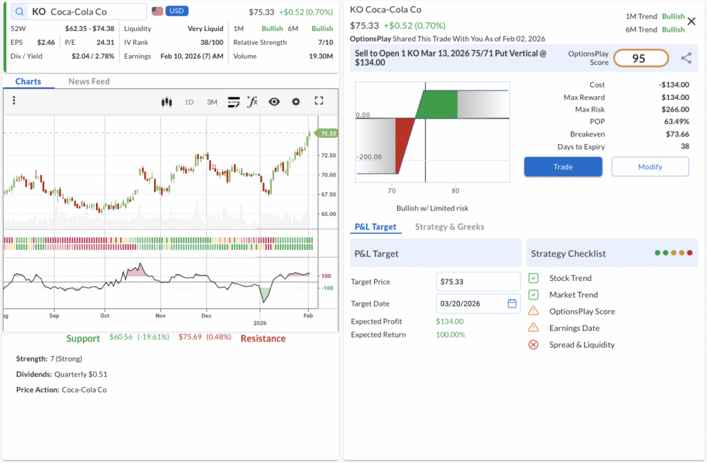 The Trade: Sell to Open the KO Mar 13 2026 75/71 Put Vertical @ $1.34 Credit.