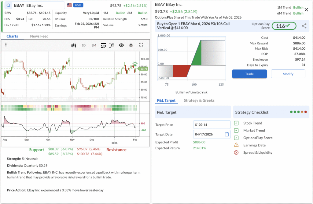The Trade: Buy to Open the EBAY Mar 06 2026 93/106 Call Vertical @ $4.14 Debit.