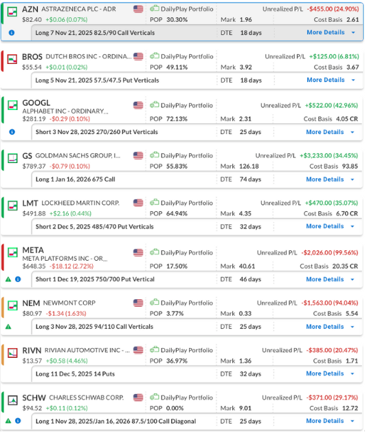 Bearish Debit Spread – Dutch Bros Inc. (BROS) – This position is showing a minor gain, and we plan to hold it for now. The company is approaching its upcoming earnings report on Wednesday, November 5, after the close.