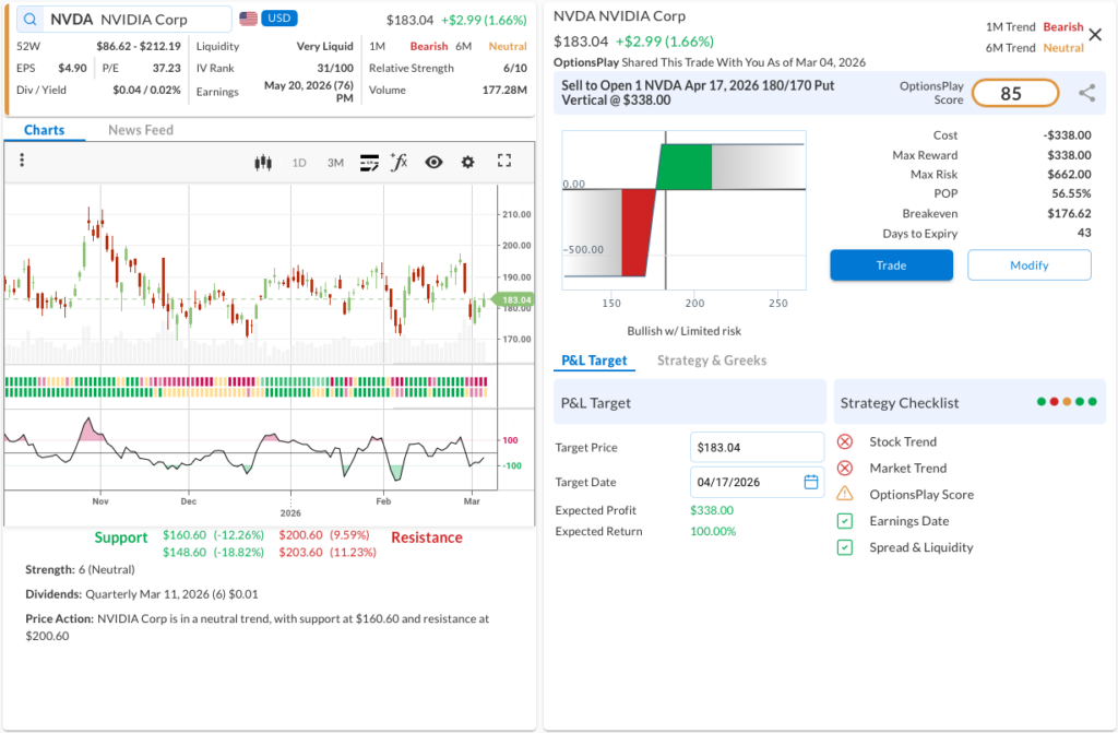 - The Trade: Sell to Open the NVDA Apr 17, 2026 180/170 Put Vertical @ $3.38 Credit.