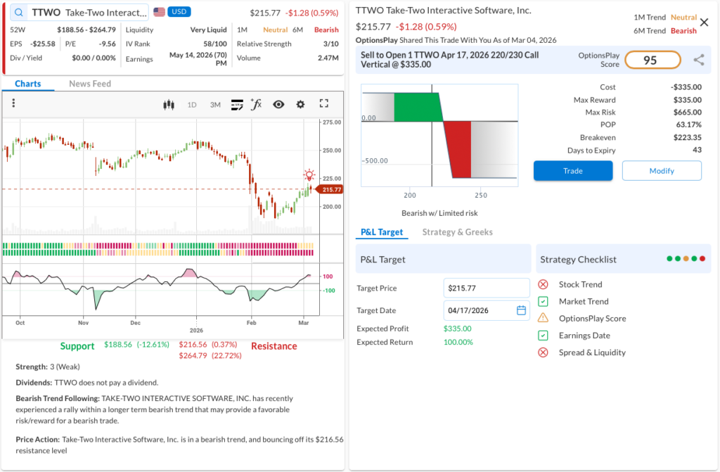 - The Trade: Sell to Open the TTWO Apr 17, 2026 220/230 Call Vertical @ $3.35 Credit.