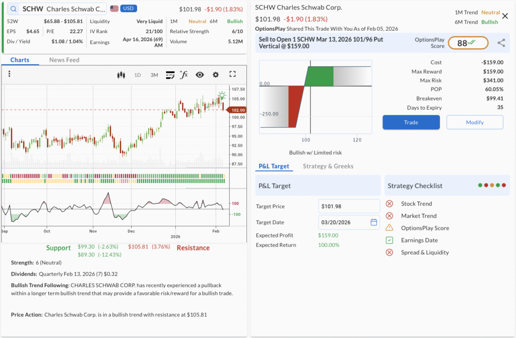 The Trade: Sell to Open the SCHW Mar 13 2026 101/96 Put Vertical @ $1.59 Credit.