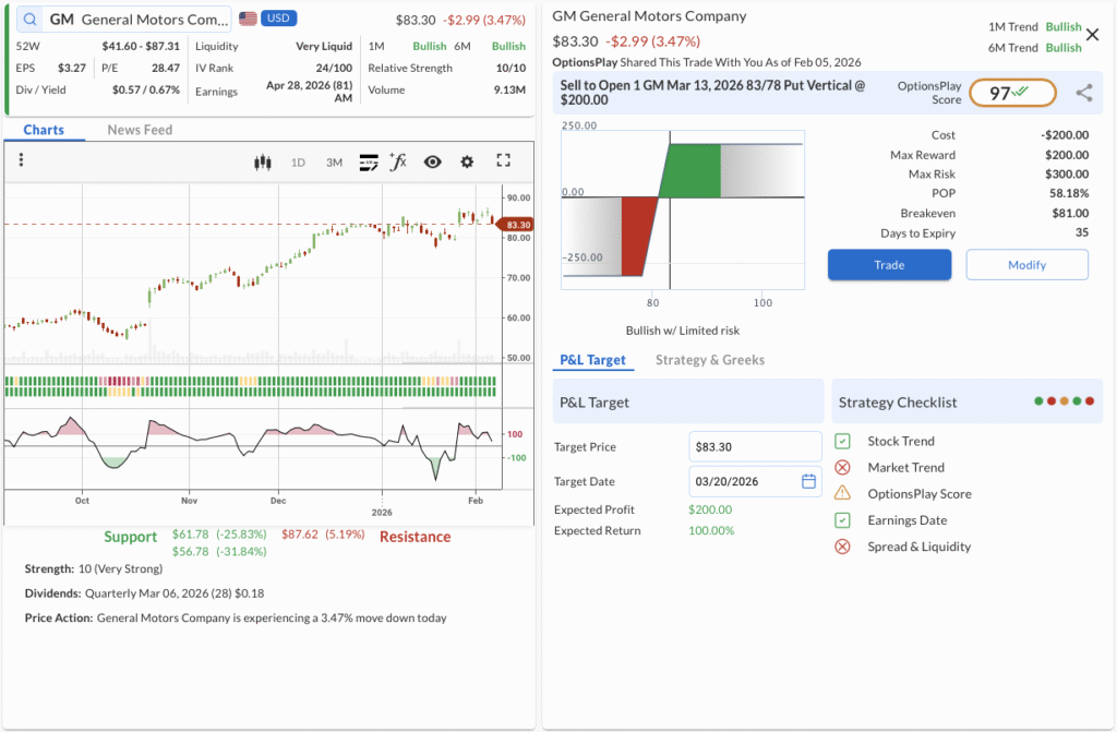 The Trade: Sell to Open the GM Mar 13 2026 83/78 Put Vertical @ $2.00 Credit.