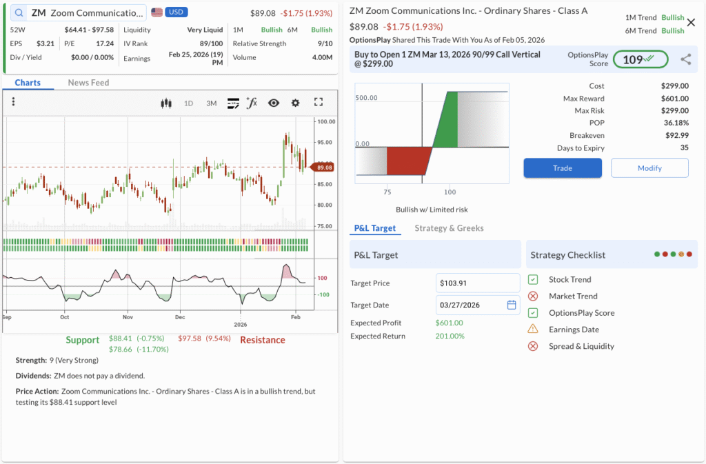 The Trade: Buy to Open the ZM Mar 13 2026 90/99 Call Vertical @ $2.99 Debit.