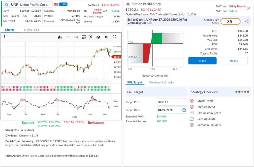 - The Trade: Sell to Open the UNP Apr 17, 2026 250/240 Put Vertical @ $3.45 Credit.