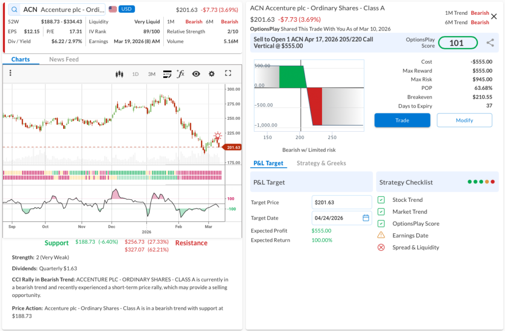 - The Trade: Sell to Open the ACN Apr 17, 2026 205/220 Call Vertical @ $5.55 Credit.