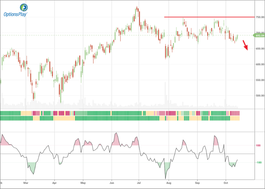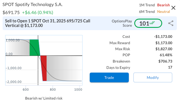 To express a bearish view with defined risk, consider selling the SPOT Oct 31, 2025 695/725 Call Vertical for a net credit of $11.73. This trade profits if SPOT remains below $695 at expiration, with a maximum reward of $1,173 and maximum risk of $1,827. The October 31, 2025 expiration was deliberately chosen to avoid exposure to the November 4 earnings report, thereby minimizing event-driven risk while maintaining exposure to a potential downside continuation into late October.