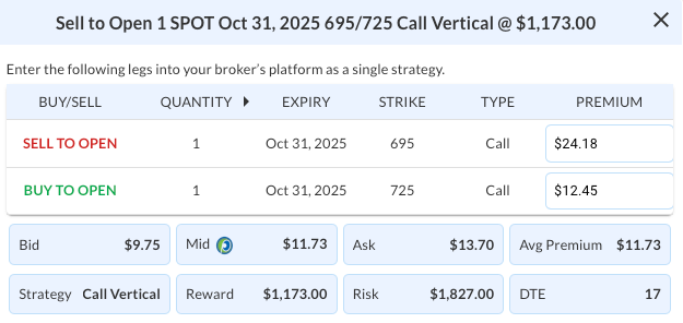 Details: Sell to Open 1 SPOT Oct 31 $695/$725 Call Vertical Spreads @ $11.73 Credit per Contract.
