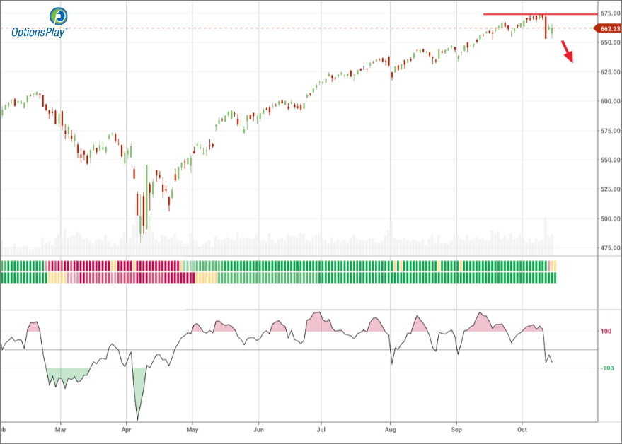 On Day 14 of the U.S. government shutdown, the ongoing political stalemate in Washington continues to pressure market sentiment. With Democrats and Republicans still deadlocked over funding measures, investors face heightened uncertainty at a time when global markets are already strained by escalating trade tensions. The tariff war with Chinahas intensified, as new U.S. levies on imported wood, furniture, and cabinetry take effect alongside Beijing’s export restrictions on rare earth metals and battery components. These combined fiscal and trade headwinds underscore rising risks to growth, supply chains, and corporate margins. Against this backdrop of policy gridlock and global economic fragility, short-term downside in SPY appears increasingly likely, making bearish exposure through options a timely tactical play.