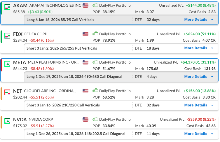 Bullish Diagonal Debit Spread – Meta Platforms, Inc. (META) – Our outlook supports a longer-term bullish approach. The position is currently showing a gain, and we plan to maintain it. We recently sold a short-term call against the longer-dated call to help reduce the overall cost basis.