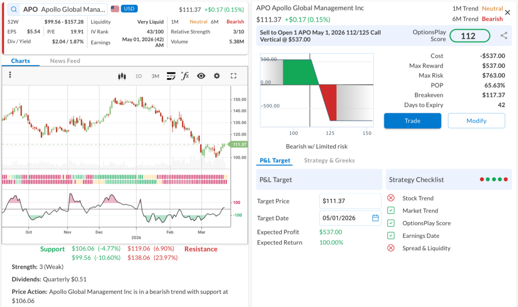 We’re betting on: If accelerating private credit defaults and rising redemption requests continue to pressure alternative asset managers, APO will struggle to break above our $112 strike, securing max profit for this bearish spread.