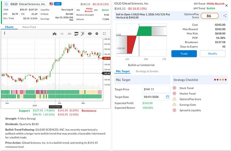 The Trade: Sell to Open the GILD May 1, 2026 141/131 Put Vertical @ $3.42 Credit.