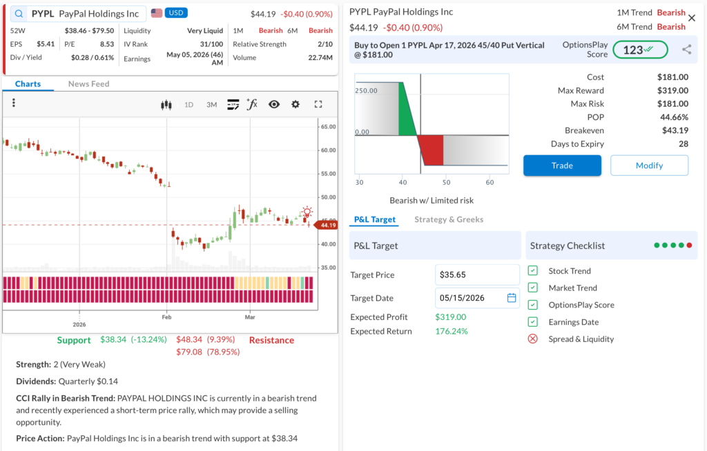 The Trade: Buy to Open the PYPL Apr 17, 2026 45/40 Put Vertical @ $1.81 Debit.