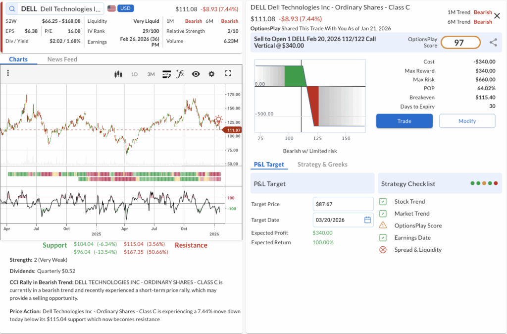 The Trade: Sell to Open the DELL Feb 20, 2026 112/122 Call Vertical @ $3.40 Credit. SELL TO OPEN Feb 20, 2026 $112 Call @ $5.60 BUY TO OPEN Feb 20, 2026 $122 Call @ $2.20