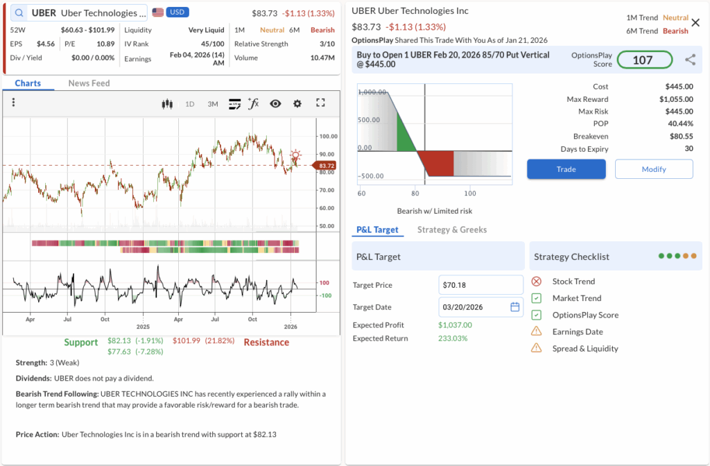 The Trade: Buy to Open the UBER Feb 20, 2026 85/70 Put Vertical @ $4.45 Debit. BUY TO OPEN Feb 20, 2026 $85 Put @ $4.95 SELL TO OPEN Feb 20, 2026 $70 Put @ $0.50