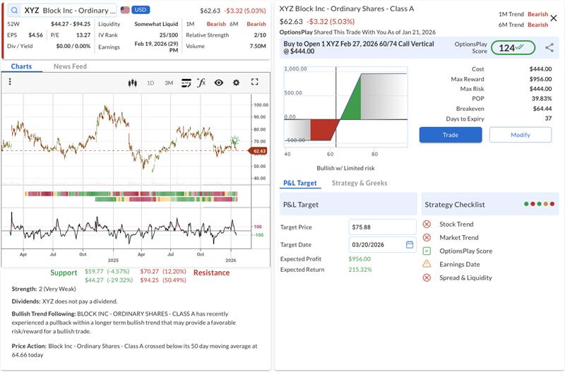 The Trade: Buy to Open the XYZ Feb 27, 2026 60/74 Call Vertical @ $4.44 Debit. BUY TO OPEN Feb 27, 2026 $60 Call @ $5.90 SELL TO OPEN Feb 27, 2026 $74 Call @ $1.46
