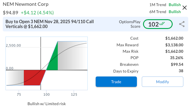 The proposed trade is a NEM Nov 28, 2025 $94/$110 Call Vertical for a debit of $5.54 ($554 total risk). This position defines risk while targeting a potential $1,046 max reward, offering an attractive risk/reward ratio of roughly 1:1.9. The $94 long strike aligns with current support, while the $110 short strike targets the upper end of the next major resistance zone. This structure captures bullish upside through earnings and into the following month, balancing directional exposure with controlled risk in case of post-earnings volatility.