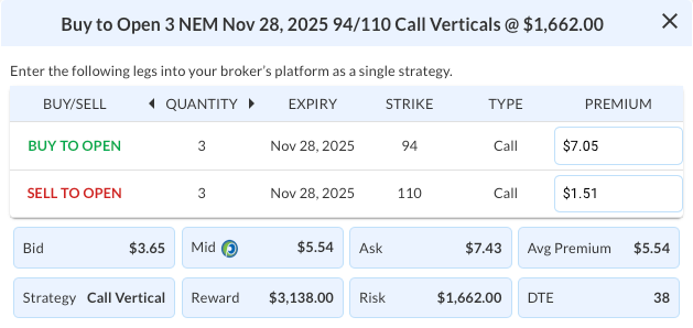 Details: Buy to Open 3 NEM Nov 28 $94/$110 Call Vertical Spreads @ $5.54 Debit per Contract.