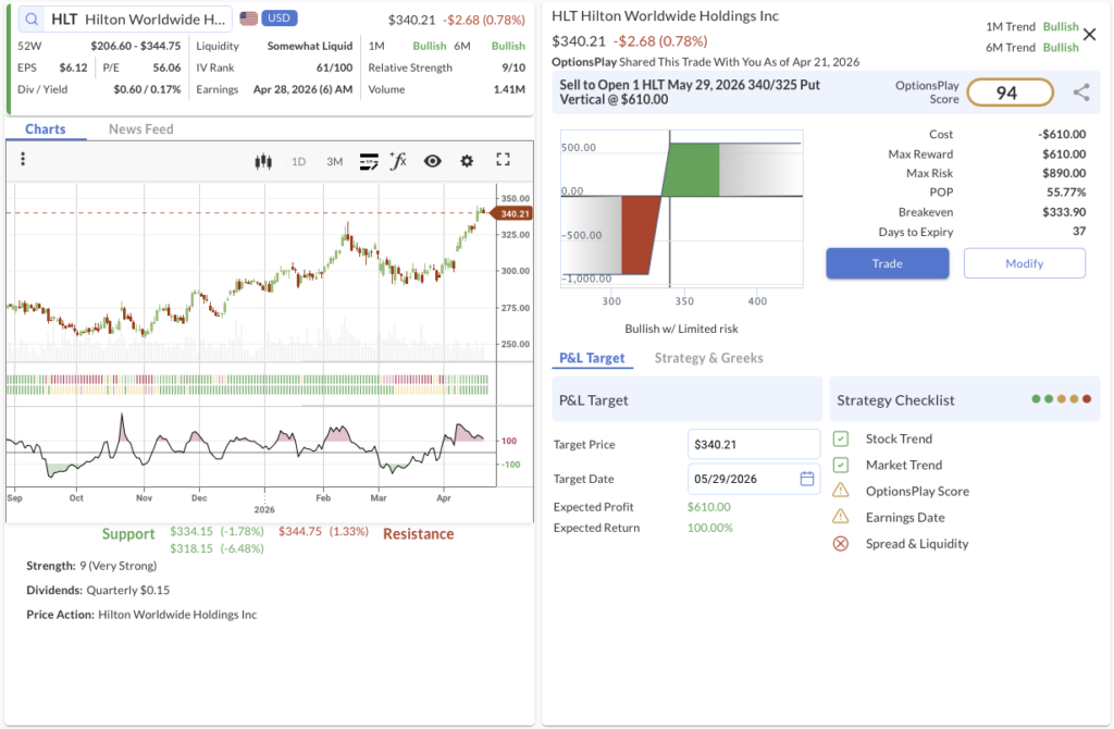 The Trade: Sell to Open the HLT May 29, 2026 340/325 Put Vertical @ $6.10 Credit.