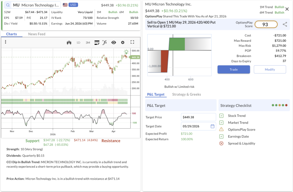 The Trade: Sell to Open the MU May 29, 2026 420/400 Put Vertical @ $7.21 Credit.