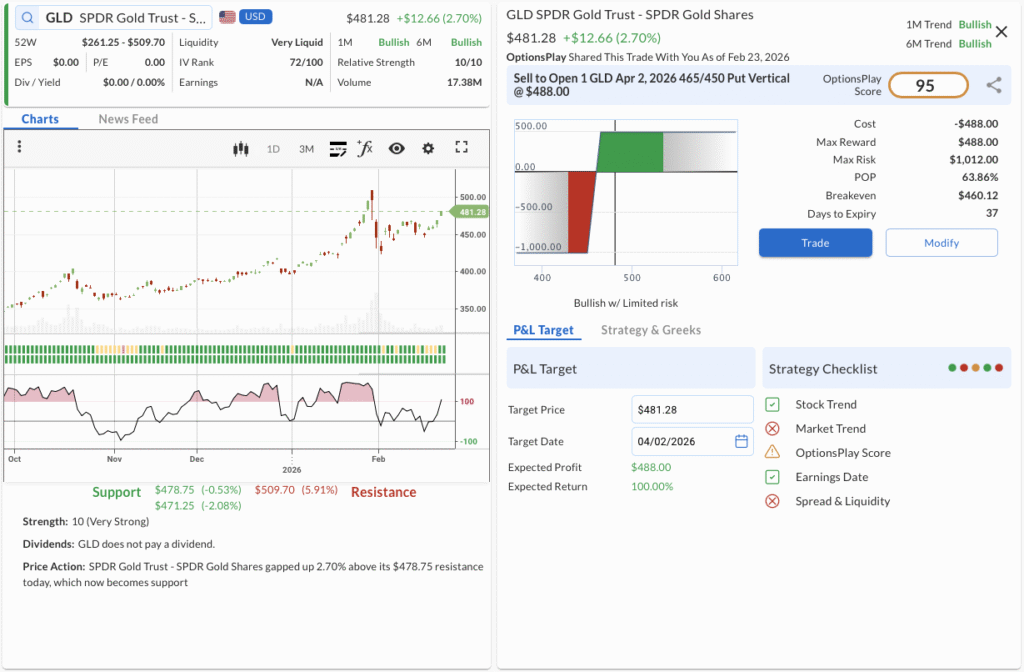 - The Trade: Sell to Open the GLD Apr 02, 2026 465/450 Put Vertical @ $4.88 Credit.