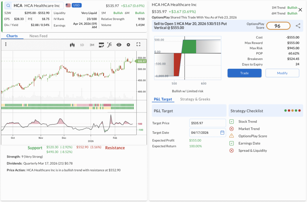 - The Trade: Sell to Open the HCA Mar 20, 2026 530/515 Put Vertical @ $5.55 Credit.