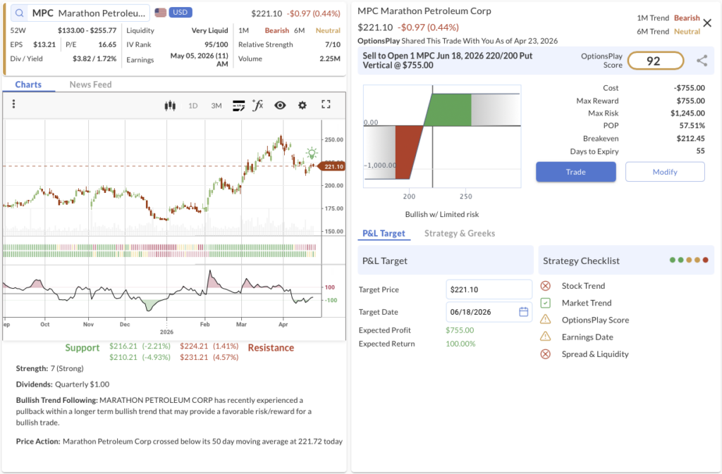 MPC: Bullish Put Spread fading a short-term dip on a top-tier refiner acting as a geopolitical hedge.