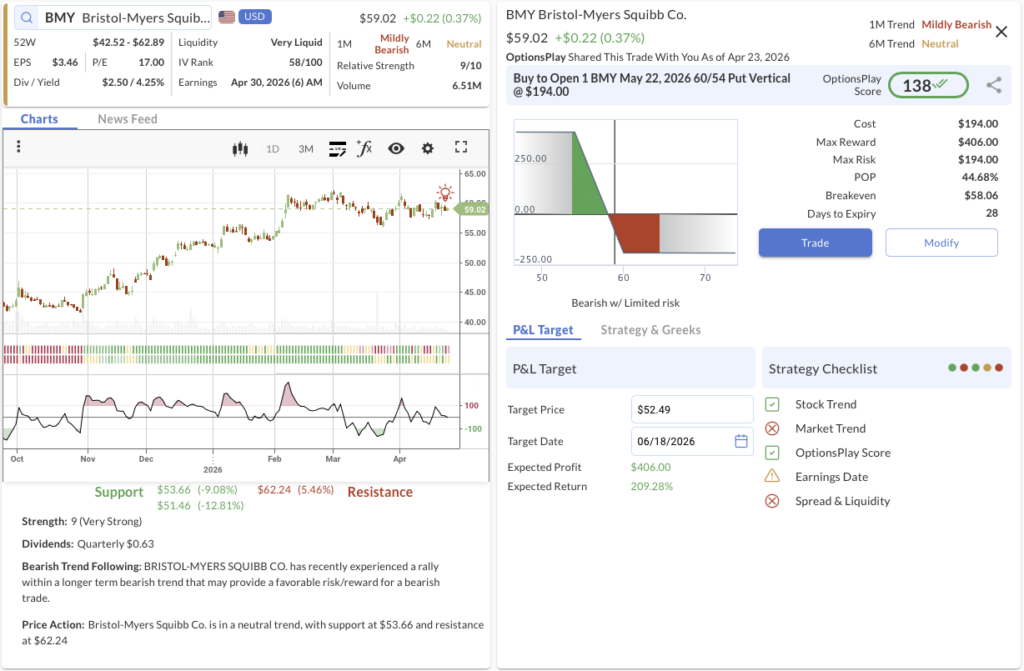 The Setup: Bristol Myers Squibb heads into its April 30 earnings with a fundamentally weak setup. EPS is expected down roughly 19% year-over-year, and analyst sentiment is drifting lower. Our Flow Playbook specifically flags to “Avoid Pharma” right now, and the stock recently triggered a bearish trend-following alert. Because options volatility skew is unfavorable for a short call spread, utilizing a defined-risk long put vertical is the optimal way to play the downside.
