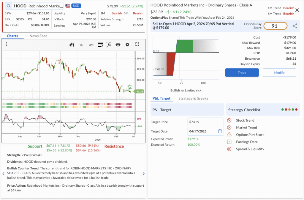 - The Trade: Sell to Open the HOOD Apr 02, 2026 70/65 Put Vertical @ $1.79 Credit.