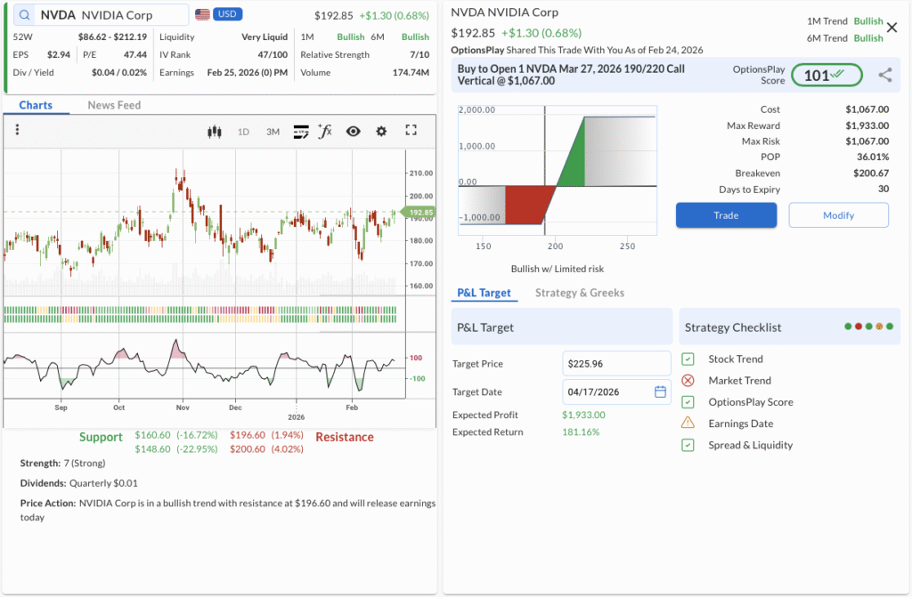 - The Technicals: The stock is maintaining a confirmed Bullish Trend (1M & 6M) with a solid Relative Strength of 7/10, currently testing overhead resistance at $196.60 ahead of an imminent earnings catalyst.