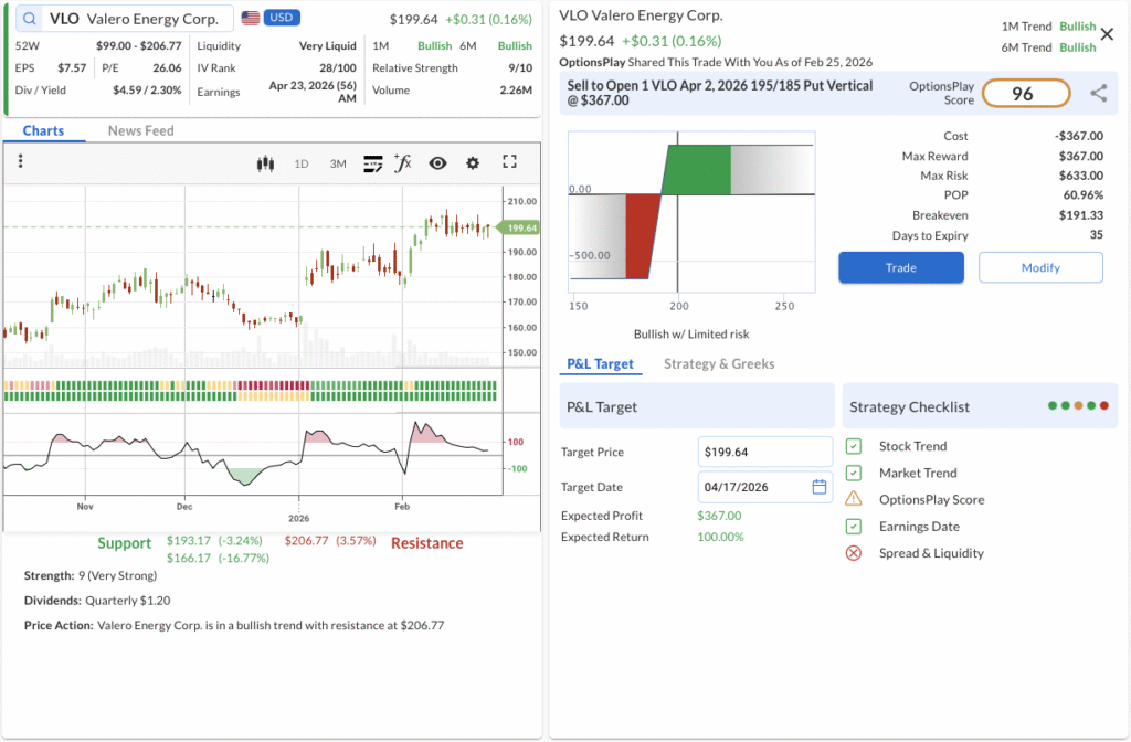 - The Trade: Sell to Open the VLO Apr 2, 2026 195/185 Put Vertical @ $3.67 Credit.