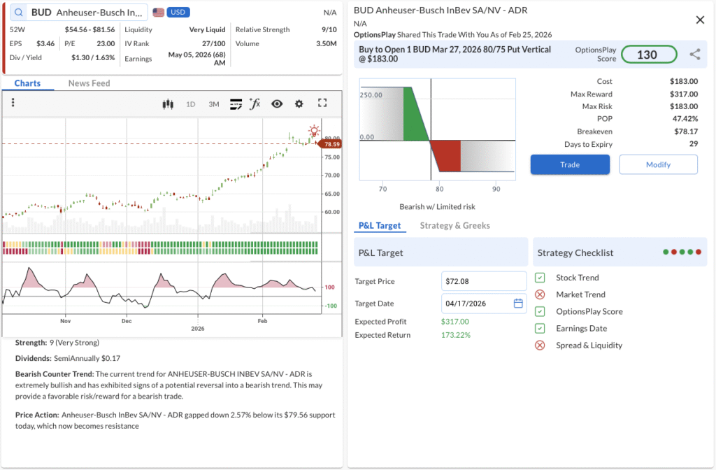 - The Trade: Buy to Open the BUD Mar 27, 2026 80/75 Put Vertical @ $1.83 Debit.