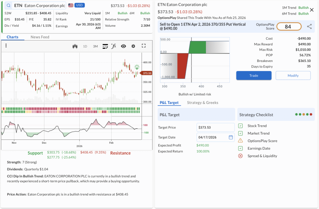 - The Technicals: Eaton is in a confirmed Bullish Trend (1M & 6M) with a solid Relative Strength of 7/10, currently experiencing a CCI dip that offers a favorable short-term pullback opportunity while holding structural support levels, with resistance at $408.45.
