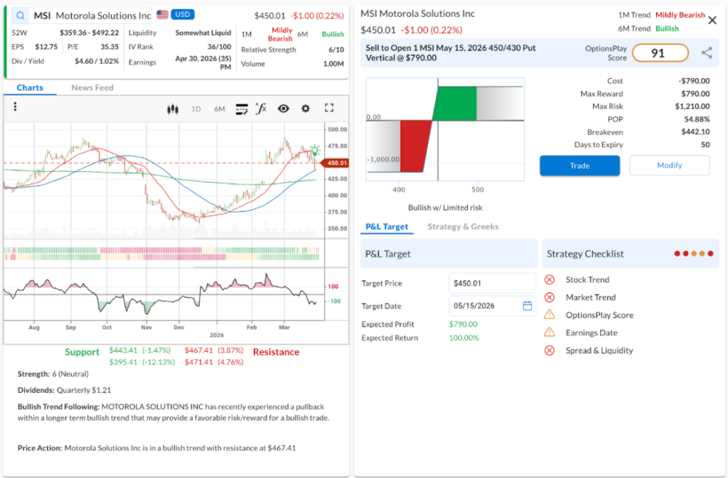 • We’re betting on: If military and security spending remains strong and drives continued demand for MSI’s products, the stock will hold its long-term bullish trend and stay above our $450 strike through mid-May.