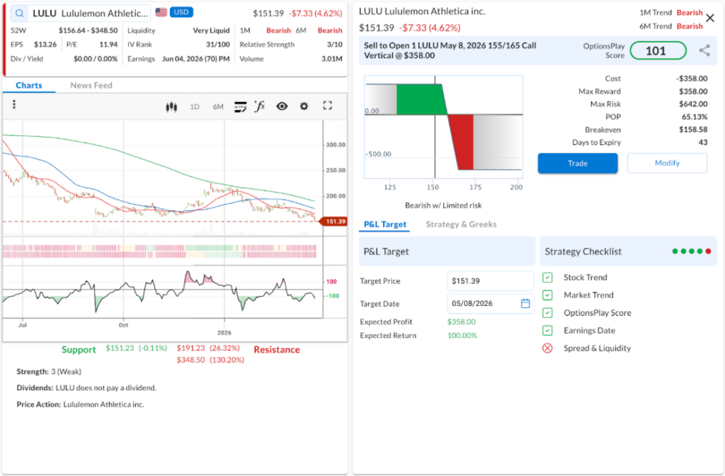 2. LULU ($151.39) – Fading the Premium Apparel View Trade in OptionsPlay