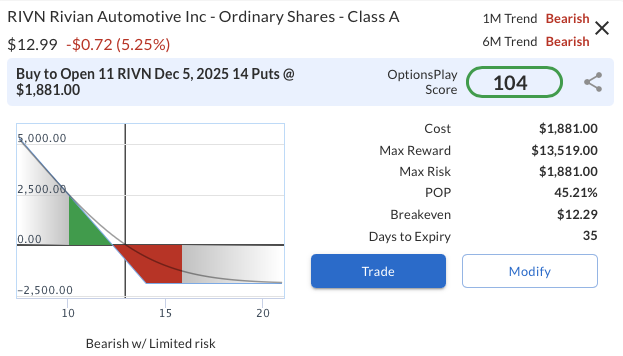 A practical bearish approach is to purchase the RIVN Dec 5, 2025 $14 Put, currently priced around $1.71. This trade provides straightforward downside exposure with clearly defined risk both into and after the earnings release. The maximum loss is capped at the $171 premium per contract, while the position offers meaningful upside potential if the stock continues to weaken. The structure also allows flexibility, traders can capture gains ahead of earnings if selling pressure builds, or maintain the position through the report should bearish momentum and sentiment persist.