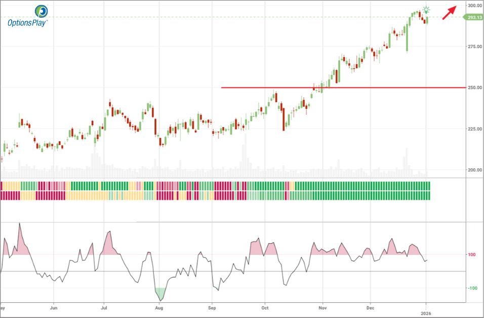 We are selling the FDX Feb 13, 2026 290/275 put vertical for a net credit of approximately $4.72. This bullish credit spread allows us to define risk while positioning for FDX to remain above the 290 level through expiration. The trade offers a maximum reward of $4.72 against a maximum risk of $10.28, resulting in a risk/reward ratio of approximately 2.2:1 (risk to reward). We are collecting about 31.5% of the spread width in premium, providing an attractive probability-weighted setup that benefits from time decay while maintaining clearly defined downside exposure aligned with our bullish thesis.