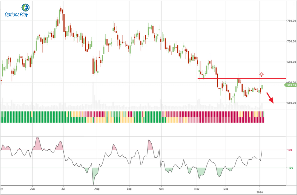 Spotify Technology (SPOT) presents an attractive bearish setup as the stock struggles to sustain upside momentum following a counter-trend rally within a broader downtrend. After a strong advance earlier in the year, price action has shifted decisively, with recent rebounds failing to alter the prevailing bearish structure. Within the OptionsPlay platform, this price behavior has triggered a Bearish Trend Following alert, highlighting a favorable risk/reward window to position for renewed downside as valuation, momentum, and market structure begin to realign lower.