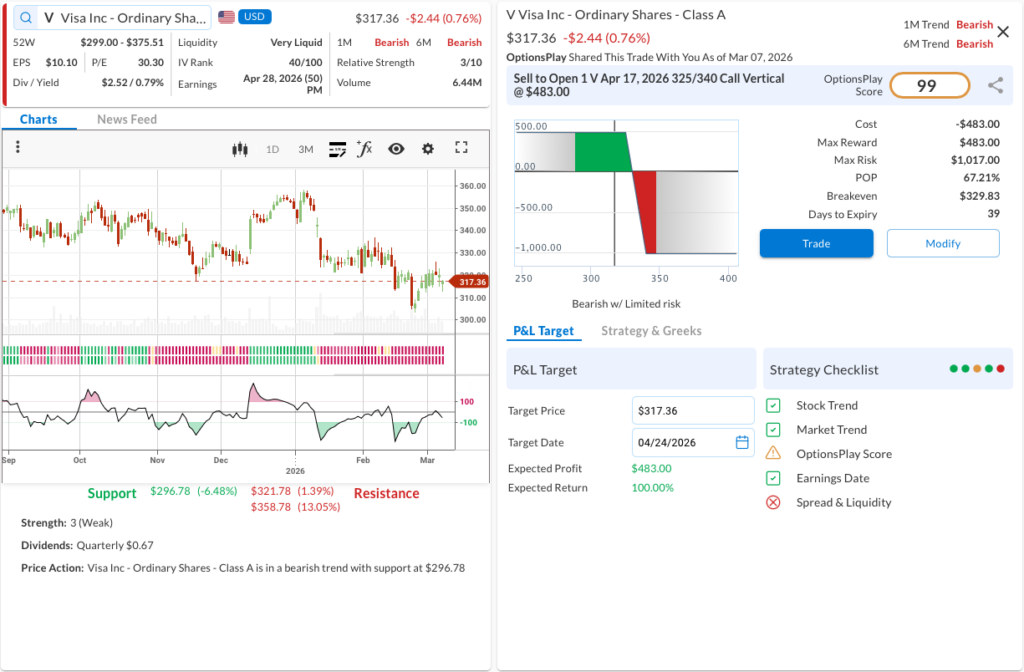 • The Trade: Sell to Open the V Apr 17, 2026 325/340 Call Vertical @ $4.83 Credit.