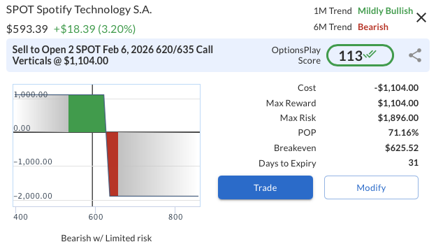 To express a bearish, risk-defined view, consider selling the SPOT Feb 6, 2026 $620/$635 call vertical for a credit of approximately $5.52. This structure offers a defined reward-to-risk ratio of roughly 0.58:1, with the premium collected equating to about 37% of the $15-wide spread. Maximum profit of $5.52 is achieved if SPOT remains below $620 at expiration, while maximum risk is capped at $9.48 should the stock reclaim and hold above $635. Notably, this expiration occurs ahead of Spotify’s expected earnings report in the second week of February, reducing exposure to earnings-driven volatility while maintaining bearish positioning.