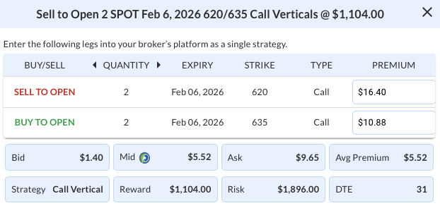 Details: Sell to Open 2 SPOT Feb 06 $620/$635 Call Vertical Spreads @ $5.52 Credit per Contract.