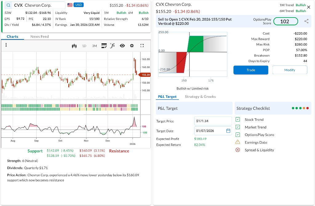 • The Trade: Sell to Open the CVX Feb 20, 2026 155/150 Put Vertical @ $2.20 Credit.